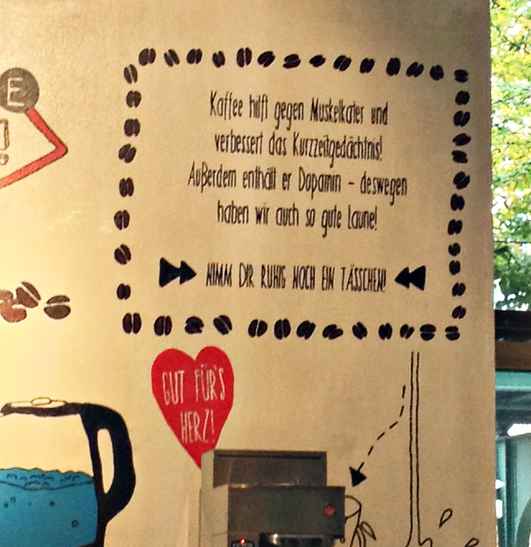 Ich schon… und da heute alles „ausnahmig“ zugeht, hatte ich heute meinen Wachmacher in einem Coffee-Shop und da läuft mir folgendes Wandgemälde durch mein noch verschleiertes Montagmorgengesichtsfeld …